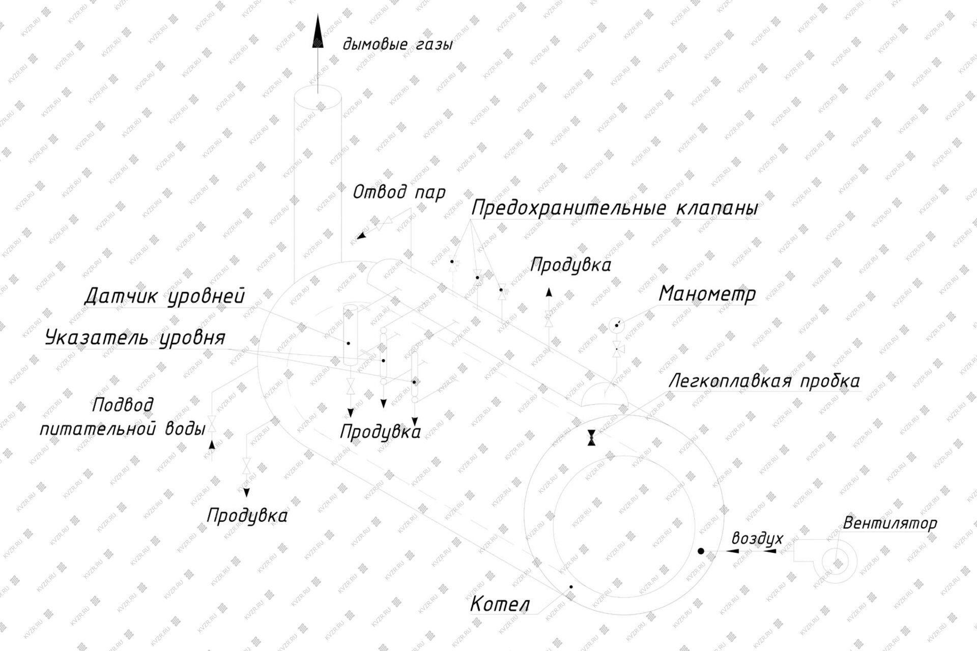 К фронтовой плите крепится воздуховод и вентилятор для подачи воздуха в топку котла под слоевую решетку. На задней крышке котла парогенератора КП 1000 в основании дымовой трубы выполнен предохранительный взрывной клапан. Образующиеся в топочной камере продукты сгорания проходят конвективный пучок труб и выводятся через трубу дымовую, установленную на корпусе в хвостовой части котла. При работе круглый парообразователь КП 1000 подпитывается водой для образования пара через штуцер. Подпитка котла ведется из питательного бака насосом через соединительную арматуру. На трубопроводе подпитки котла водой должно быть установлено запорное устройство и обратный клапан. Запорное устройство располагается между паровым котлом КПр 1000 и обратным клапаном.