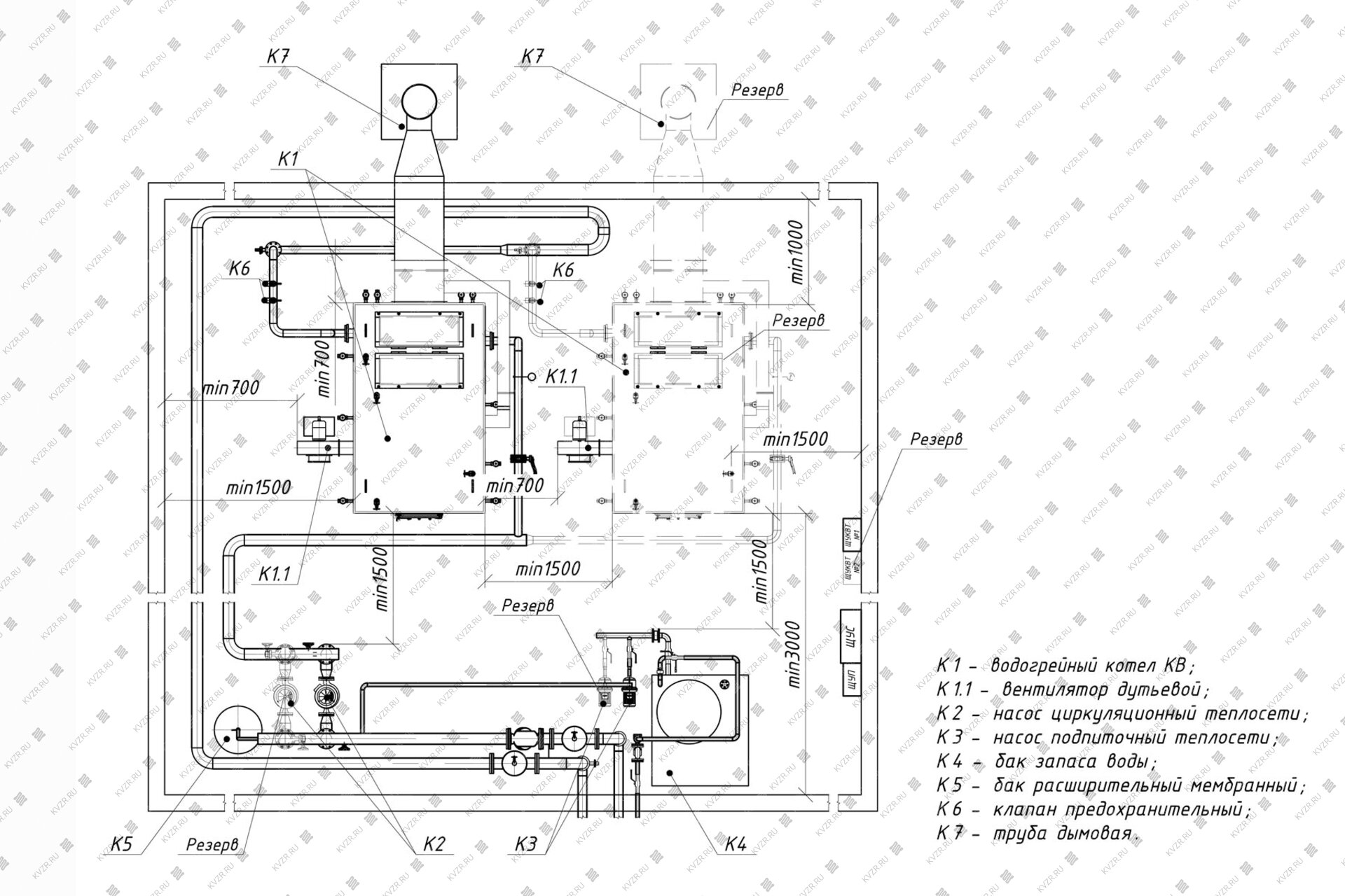 Для котельных 1 категории, являющиеся единственным источником тепла системы теплоснабжения и обеспечивающие потребителей первой категории, не имеющих индивидуальных резервных источников тепла, необходимо предусмотреть полное резервирование оборудования – подключение 2 (двух) котлов, насосов, ТДМ. Пунктиром обозначено оборудование для резервирования.