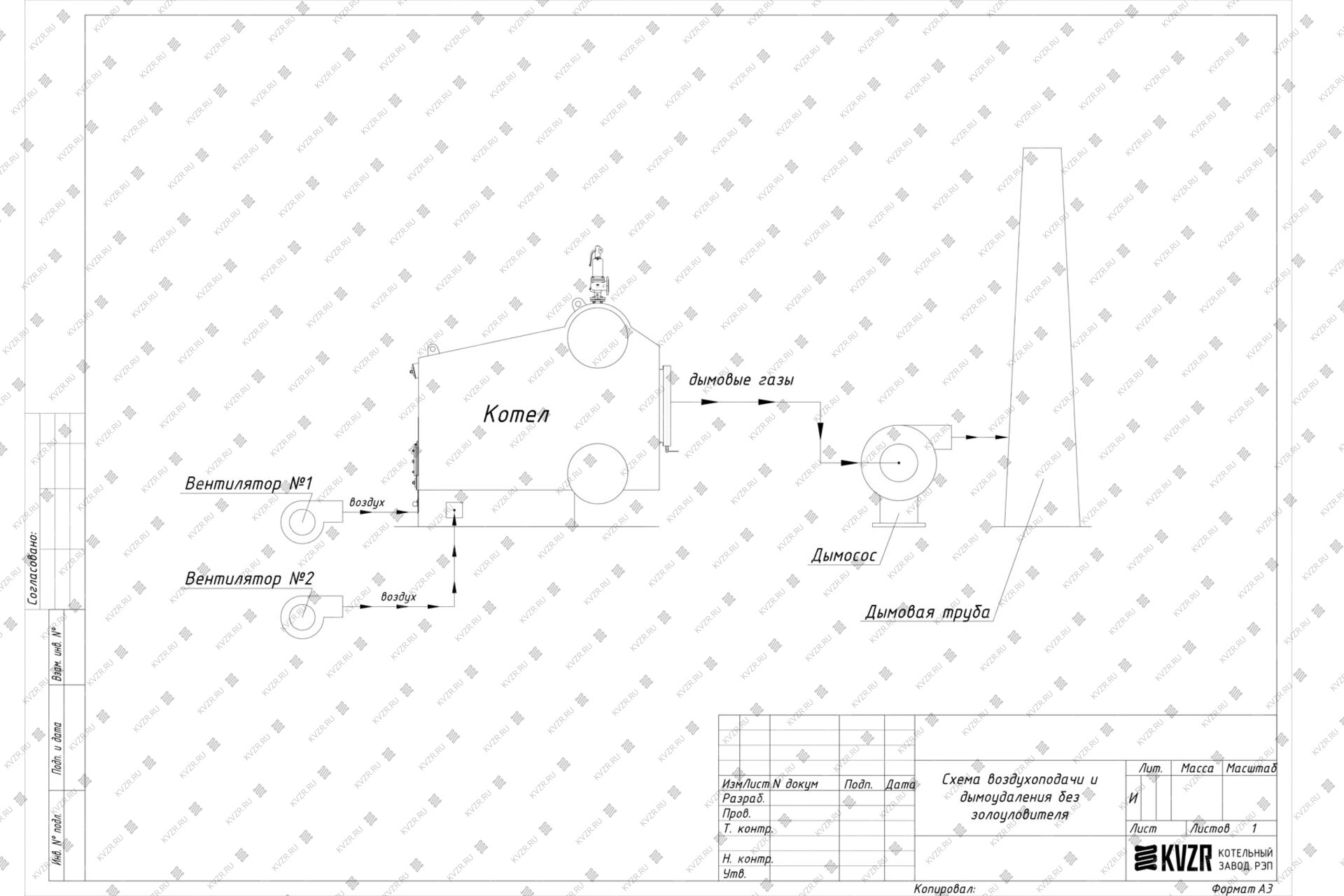 Если вам не требуется высокая очистка дымовых газов, котел может работать без золоуловителя. Схема подключения при этом следующая - дымовые газы выходят из котла в газоходы котельной, затем в дымосос и далее снова по газоходам в дымовую трубу. В зависимости от компоновки котельной дымосос может устанавливаться как в котельной, так и на улице. Наш завод производит газоходы и переходники к ним. Получив схему вашей котельной мы можем изготовить для вас комплект газоходов, переходников нужных размеров и сечений. На месте такие детали собираются как конструктор. Обращаем ваше внимание, что газоходы требуют изоляции, для защиты персонала от ожогов, так как уходящие газы имеют высокую температуру, а на улице газоходы требуют изоляции для избежания образования конденсата.