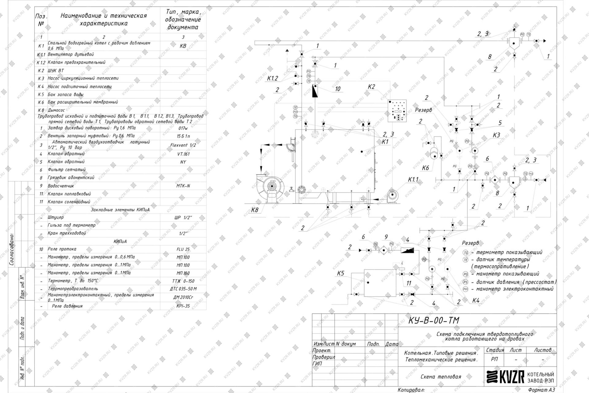 Образец тепловой схемы подключения дровяного котла на дровах 0.35 МВт и вспомогательного оборудования в котельной приведен на данной схеме. При эксплуатации очень важно грамотно осуществить подключение оборудования, установить все контрольно измерительные приборы, для контроля параметров работы котельной и запорную арматуру для оперативного переключения потока теплоносителя при плановой или аварийной остановке оборудования. Данную схему можно использовать как пример для разработки под свой объект или заказать у нас разработку индивидуальной схемы для вашей котельной.